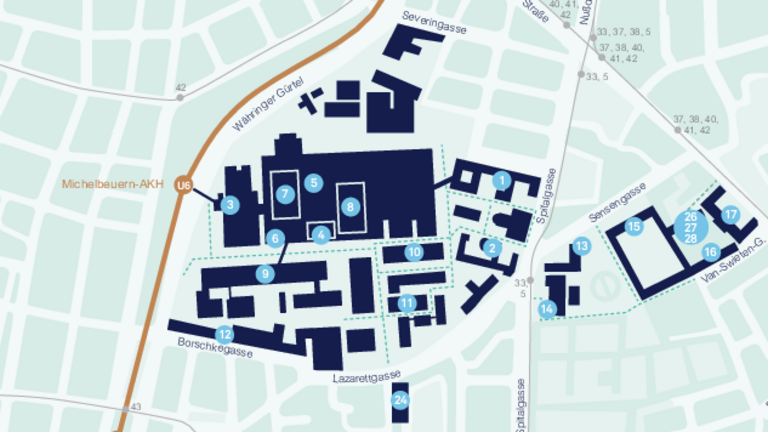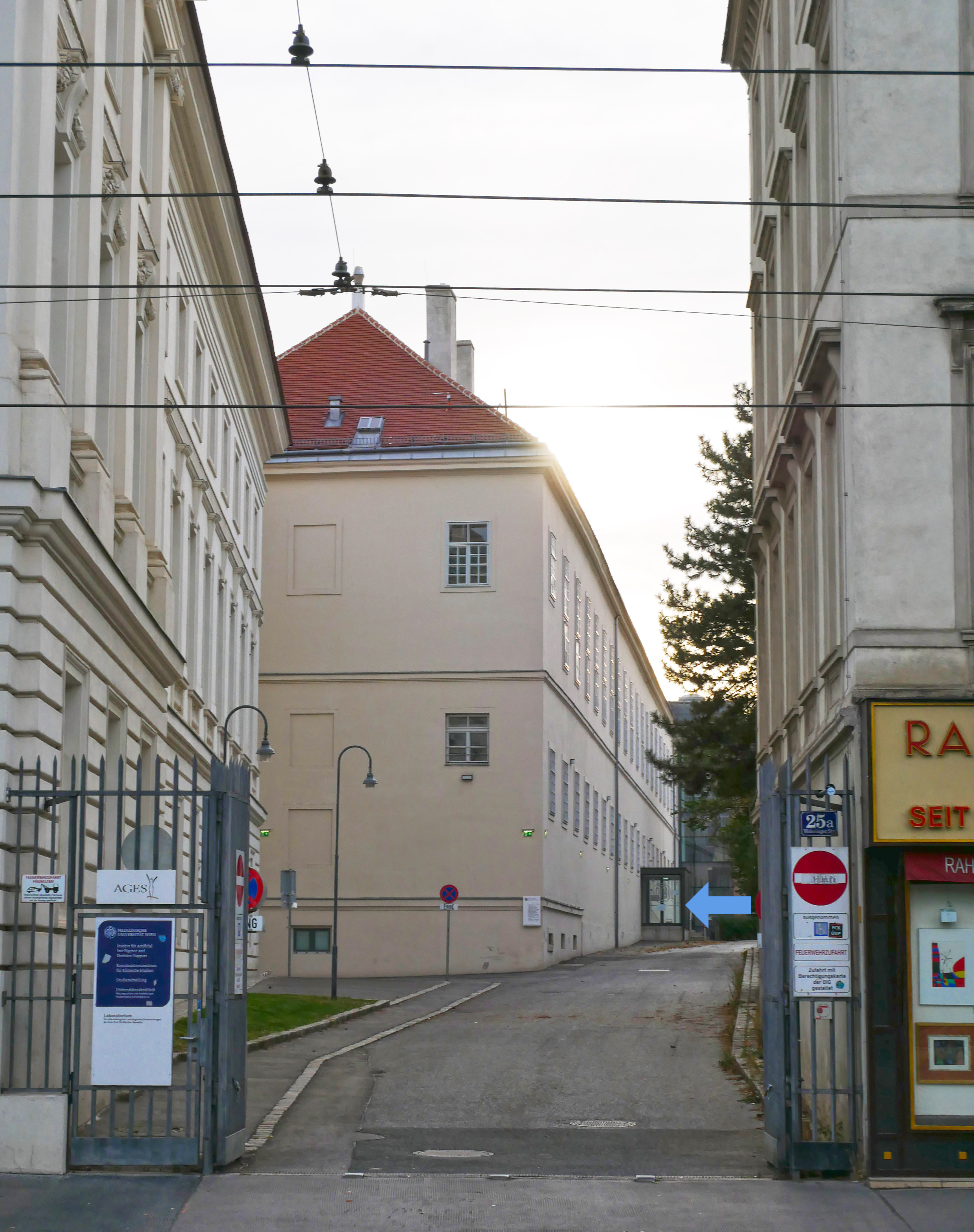 The institute is located in Vienna’s 9th district at Währinger Straße 25a, between the “Josephinum” building and Vienna University’s Department for Computer Science. Our institute is marked as building 27 (note: this is *not* the street number, which is 25a) on the map of Medical University of Vienna’s buildings, which can also be downloaded as pdf. You find us also on Google Maps. For convenient parking options, head to Sensengasse 3, our closest parking facility. Please keep in mind that parking availability may be limited and fees may apply.
